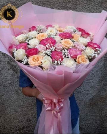 Rp 550.000Hand buket bunga terdiri dari : Mawar pink Mawar ungu Bunga lily Baby breat Free kartu ucapan