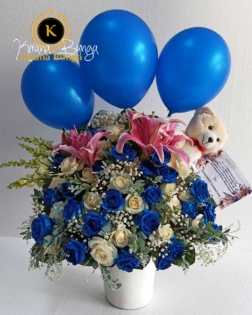 Rp 850.0001 Bh bunga baby born terdiri dari : Mawar biru Mawar putih Bunga pom-pom Baby breat Boneka Balon Kaspea