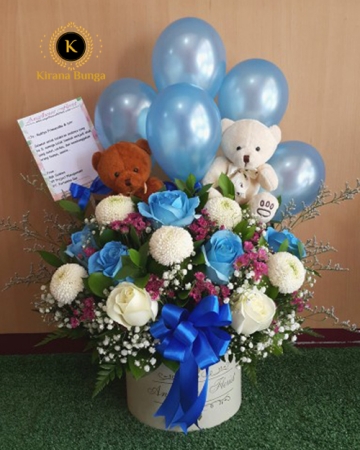 1 Bh bunga box terdiri dari : Mawar merah Mawar putih Balon Boneka Baby breat Free kartu ucapan