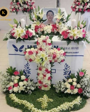 Paket bunga duka cita terdiri dari : 2 Bh standing flower 1 Bh bunga salib 2 Bh bunga meja