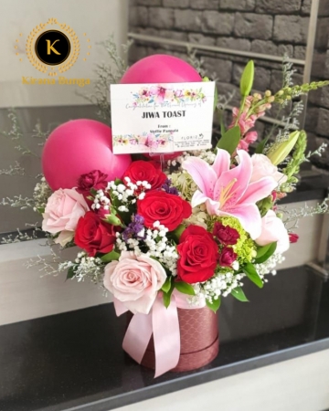 Rp 1.500.000Rangkaian bunga meja terdiri dari : Mawar Pink Mawar putih Bunga lily Snapdragon Babybreat Free kartu ucapan