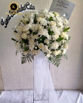 Rp 700.0001 Bh Bunga standing duka cita terdiri dari : Mawar putih Bunga krisan Baby breat Aster Daun ruskus Free kartu ucapan Gratis kirim