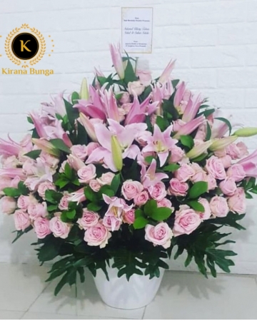 Rp 500.000 Rp 550.000Rangkaian bunga meja terdiri dari : Mawar Pink Bunga lily pink Mawar putih Baby breat Free kartu ucapan