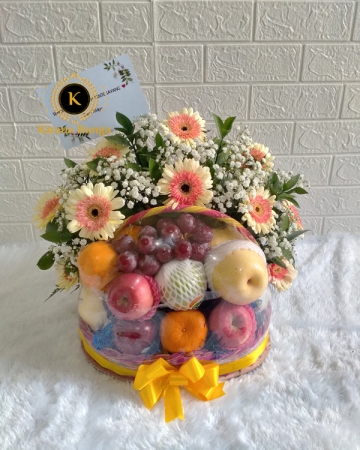 Rp 650.0001 Bh parcel buah bunga terdiri dari : Jeruk Pear Anggur Apel Mawar merah Bunga aster Baby breat