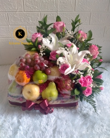Rp 550.0001 Bh Parcel buah bunga terdiri dari : Apel fuji Apel merah Jeruk sunkist Pear Anggur Jambu crystal Mawar putih Lily casblanca Baby breat Free kartu ucapan Gratis ongkos kirim