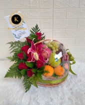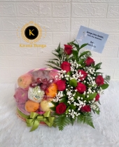 1 Bh parcel buah bunga terdiri dari : Jeruk Pear Anggur Apel Mawar merah Bunga aster Baby breat