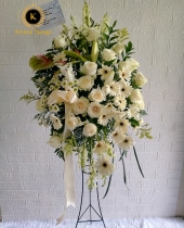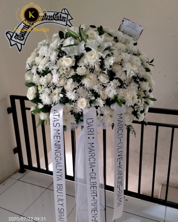 Rp 800.0001 Bh standing flower terdiri dari : Mawar putih Bunga krisan Lily casablanca Pikok Baby breat Free kartu ucapan