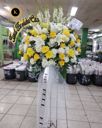 1 Bh Bunga standing duka cita terdiri dari : Mawar putih Bunga krisan Baby breat Aster Daun ruskus Free kartu ucapan Gratis kirim